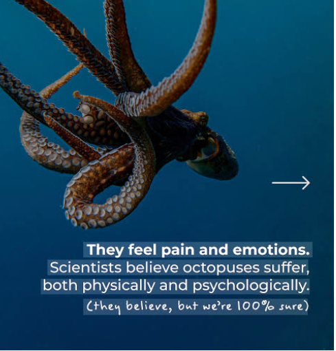 Even more alarming is the push to industrialize octopus farming. Octopuses are solitary by nature and highly sensitive to stress. Confining them in crowded tanks leads to aggression, injury, and prolonged suffering. Unlike traditional livestock, octopuses cannot be farmed humanely, making large-scale production both unethical and environmentally damaging.