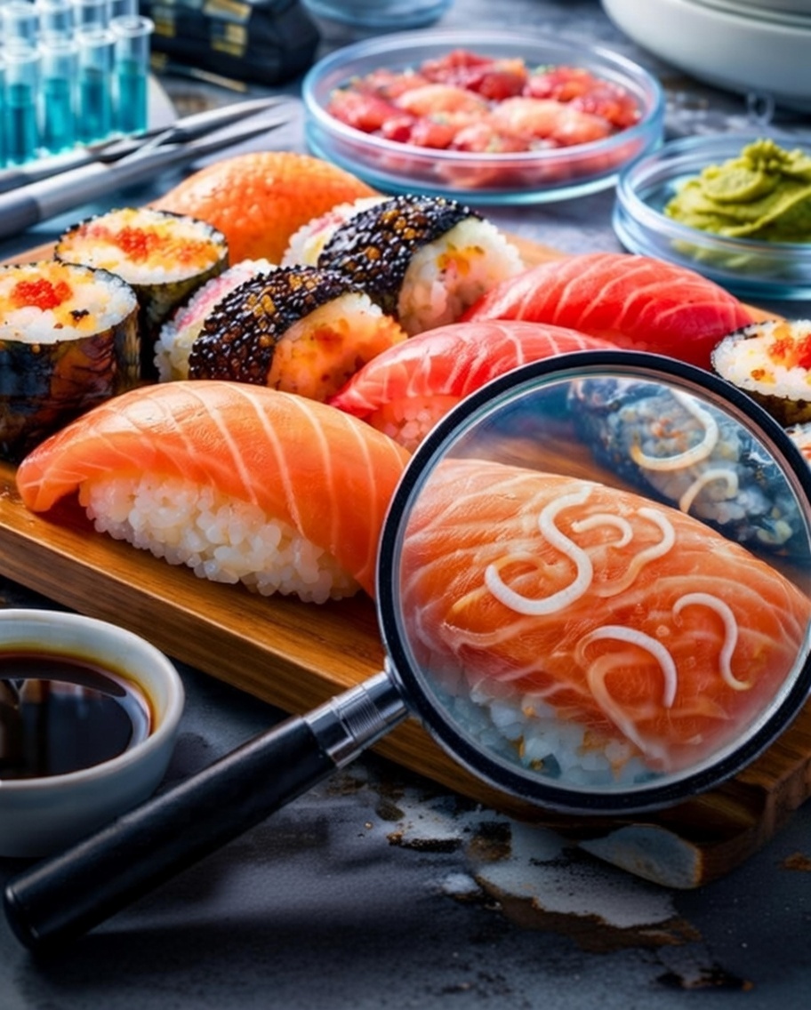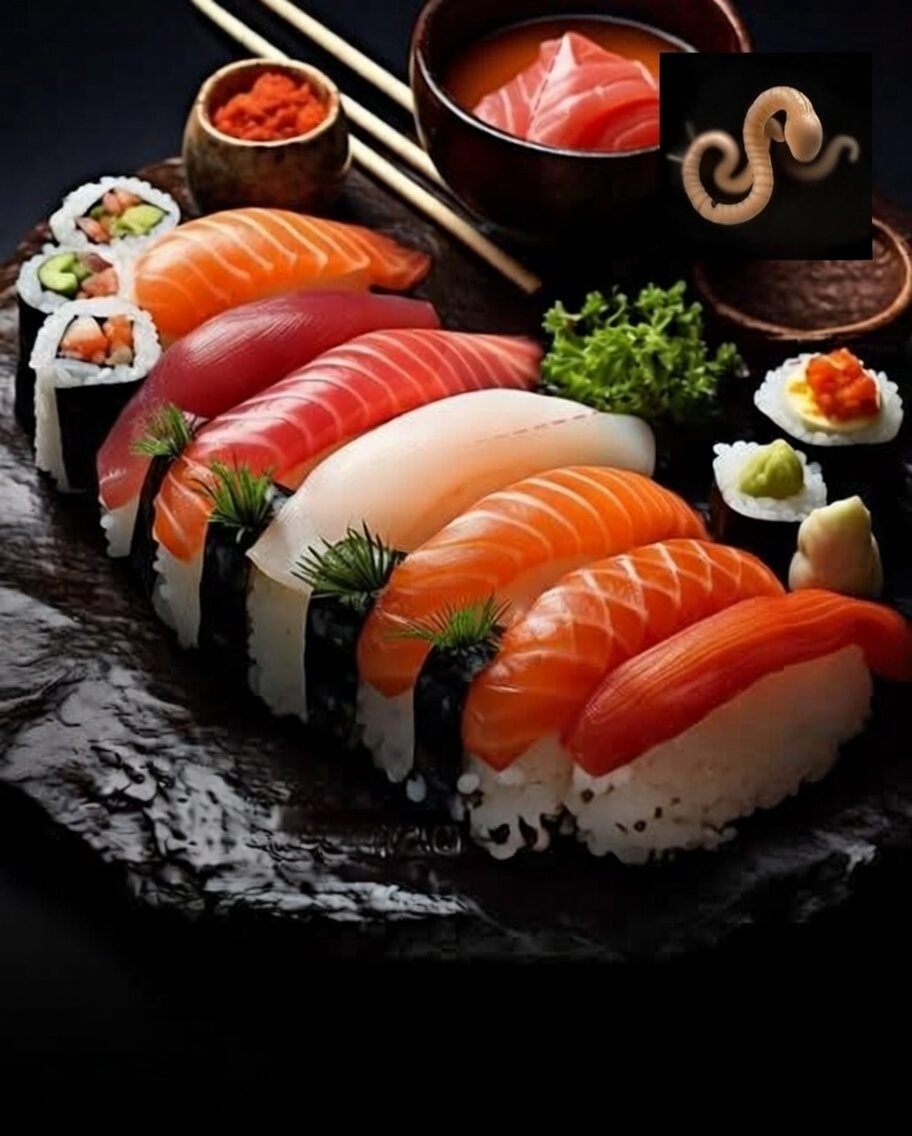 Foods like sushi, sashimi, ceviche, or lightly cooked fish may contain parasitic worms such as anisakis.